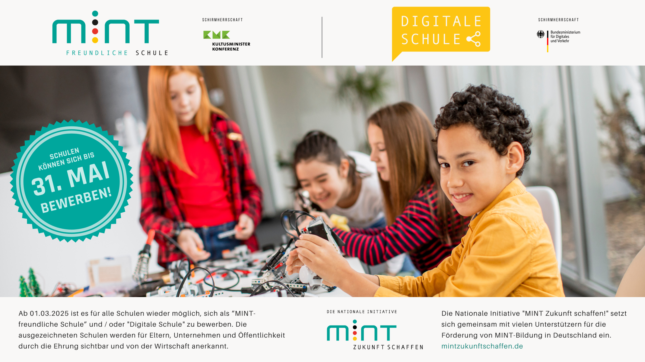 „In einer Welt, die immer digitaler wird, ist es wichtiger denn je, dass unsere Schülerinnen und Schüler über solide MINT-Kompetenzen verfügen. Die Siegel ‚MINT-freundliche Schule‘ und ‚Digitale Schule‘ sind ein wertvoller Kompass für alle Schulen, die ihre Schülerinnen und Schüler optimal auf die Herausforderungen der Zukunft vorbereiten wollen. Ich lade alle Schulen herzlich ein, sich zu bewerben und gemeinsam mit uns die Bildungslandschaft in Deutschland zu gestalten,“ so Prof. Christoph Meinel, Vorstandsvorsitzender MINT Zukunft schaffen.